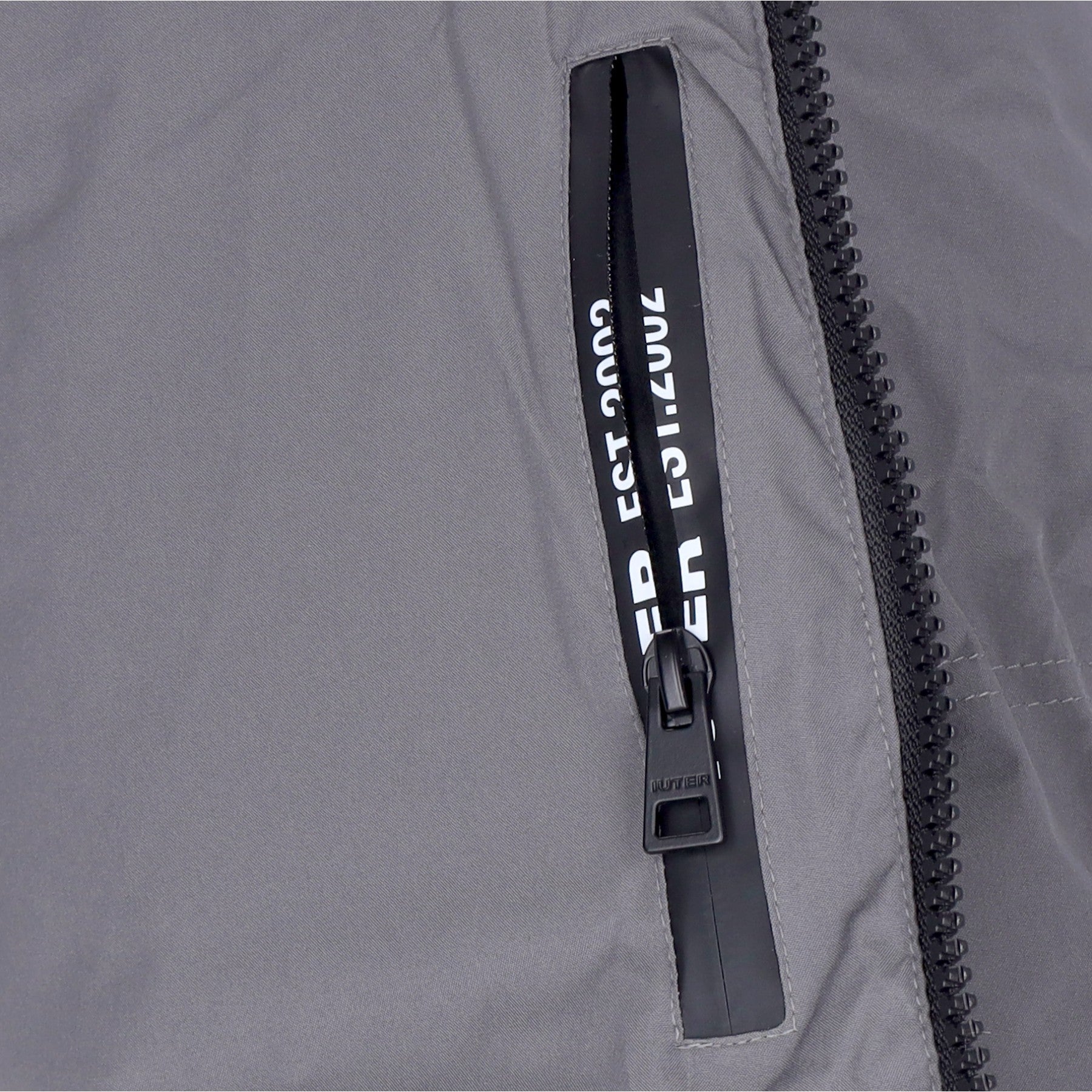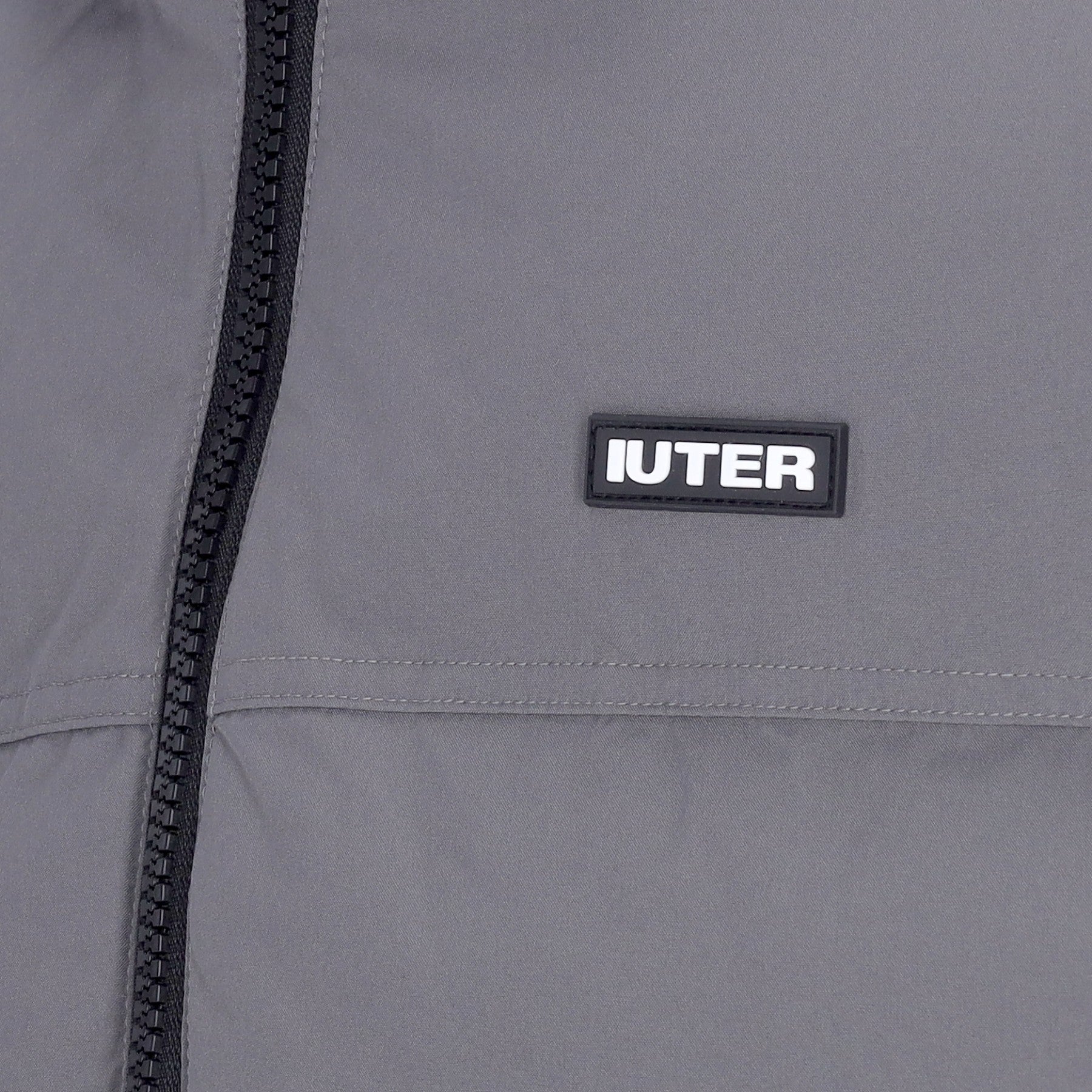 Auf die Kapuze gesticktes Iuter-Logo und auf der linken Seite gummierte Applikation
