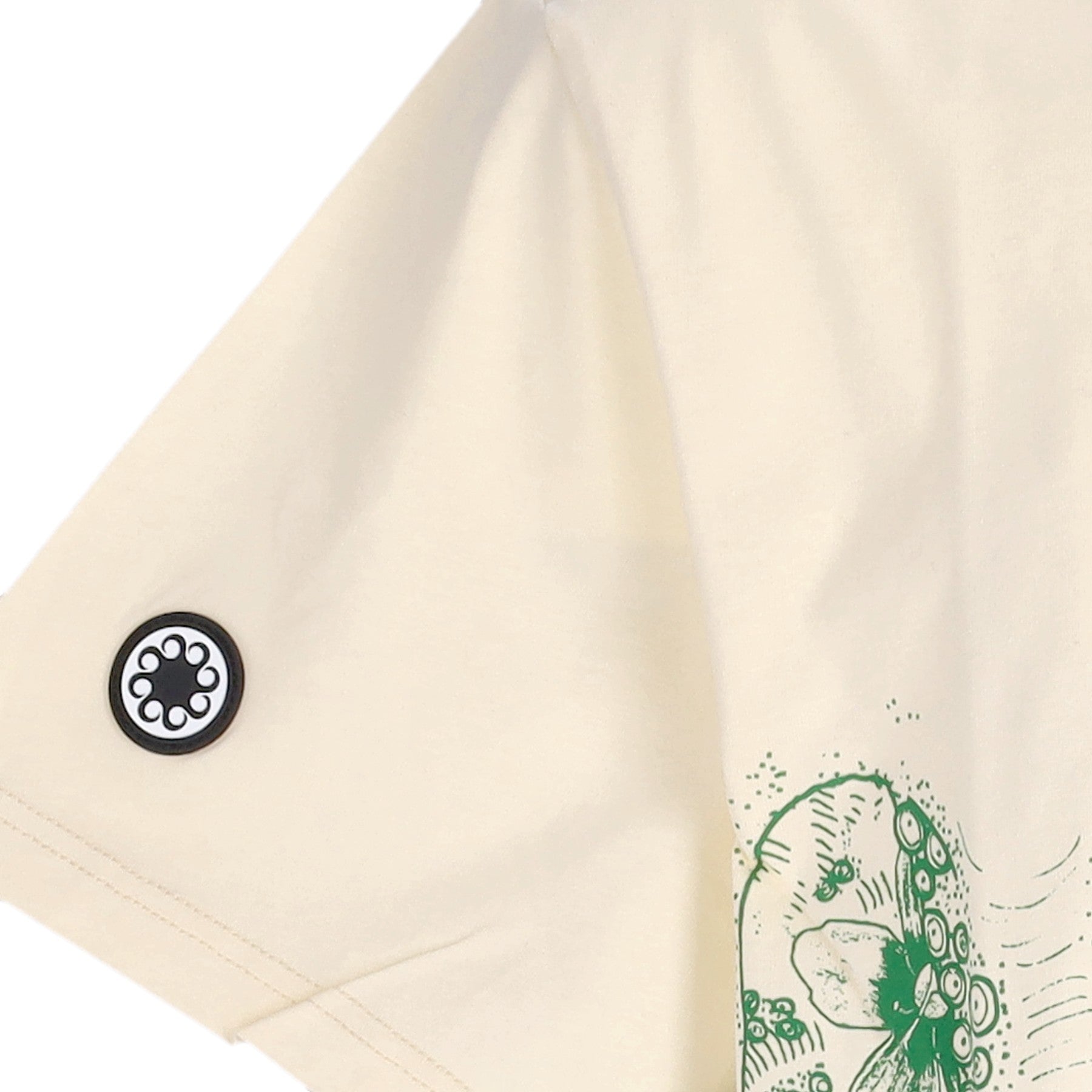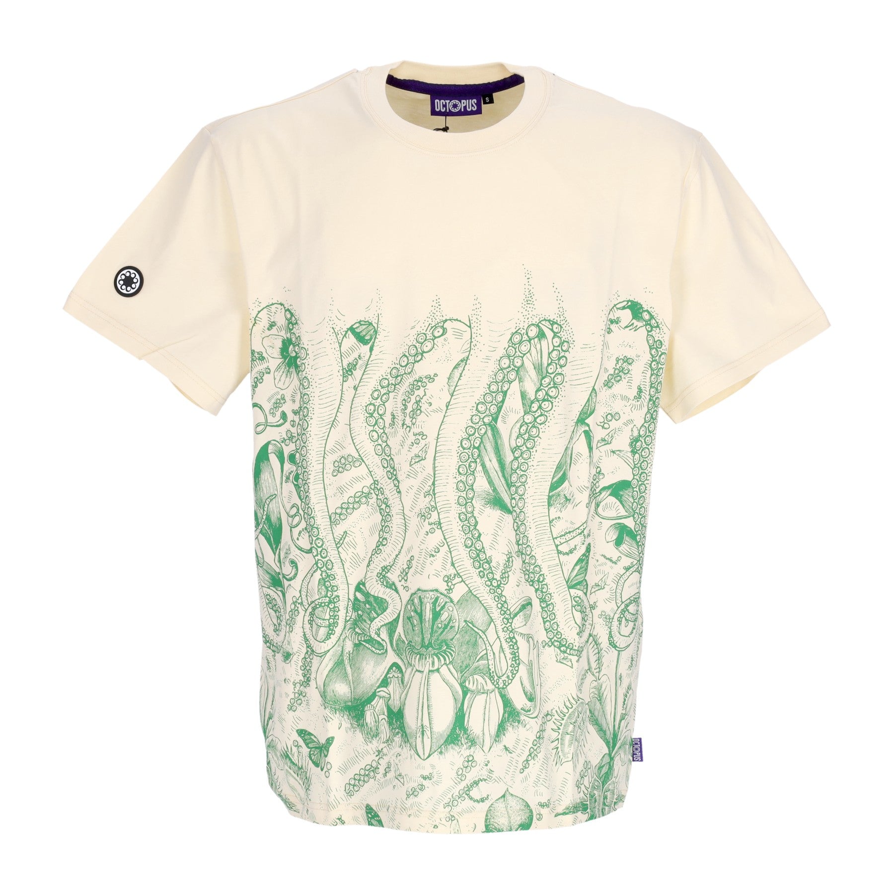Gummiaufnäher mit Octopus-Logo auf dem rechten Ärmel angebracht und auf das auf der Unterseite aufgenähte Etikett gestickt