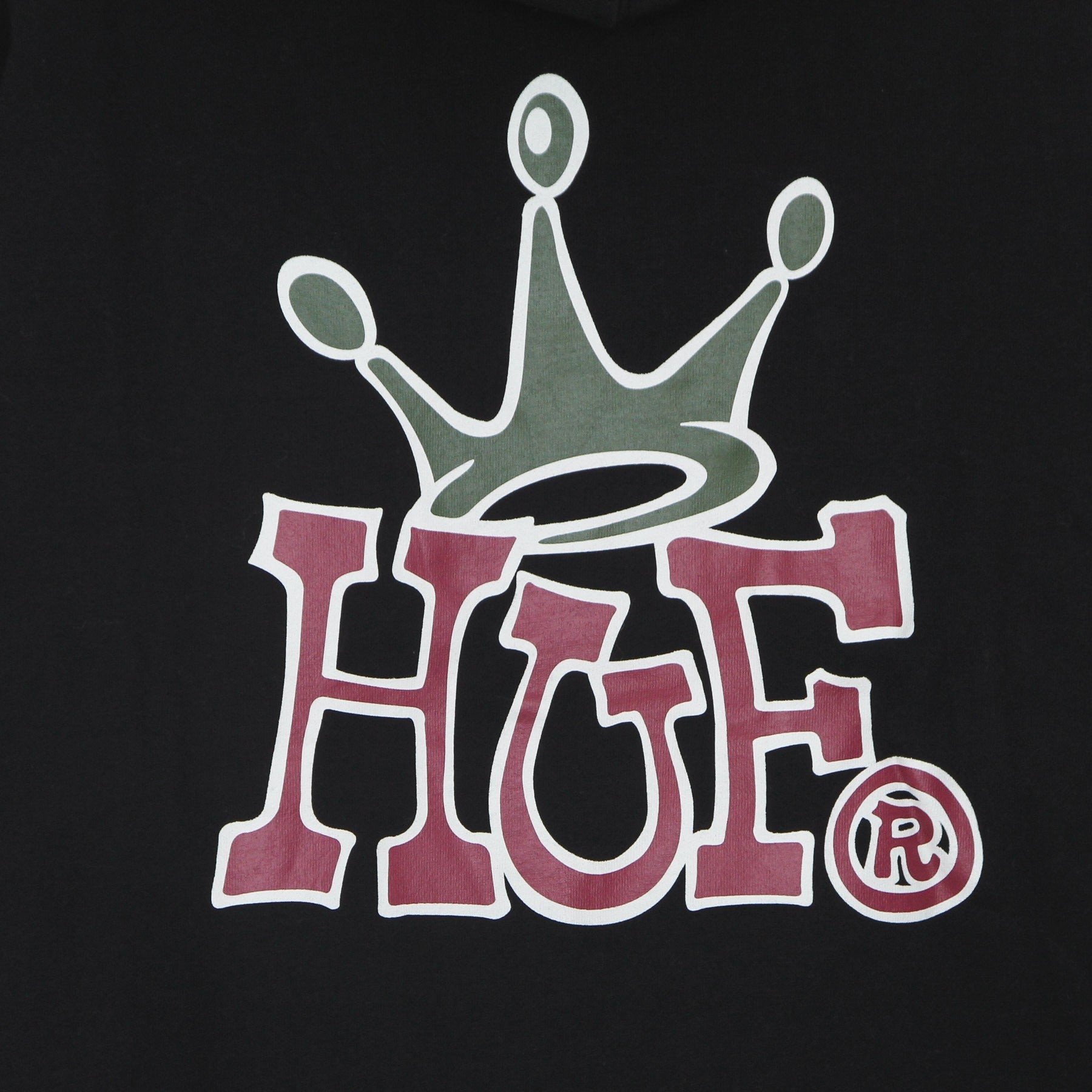 Individuelles Huf-Logo auf der linken Seite und auf der Rückseite aufgedruckt und auf einem an der Unterseite aufgenähten Etikett gestickt