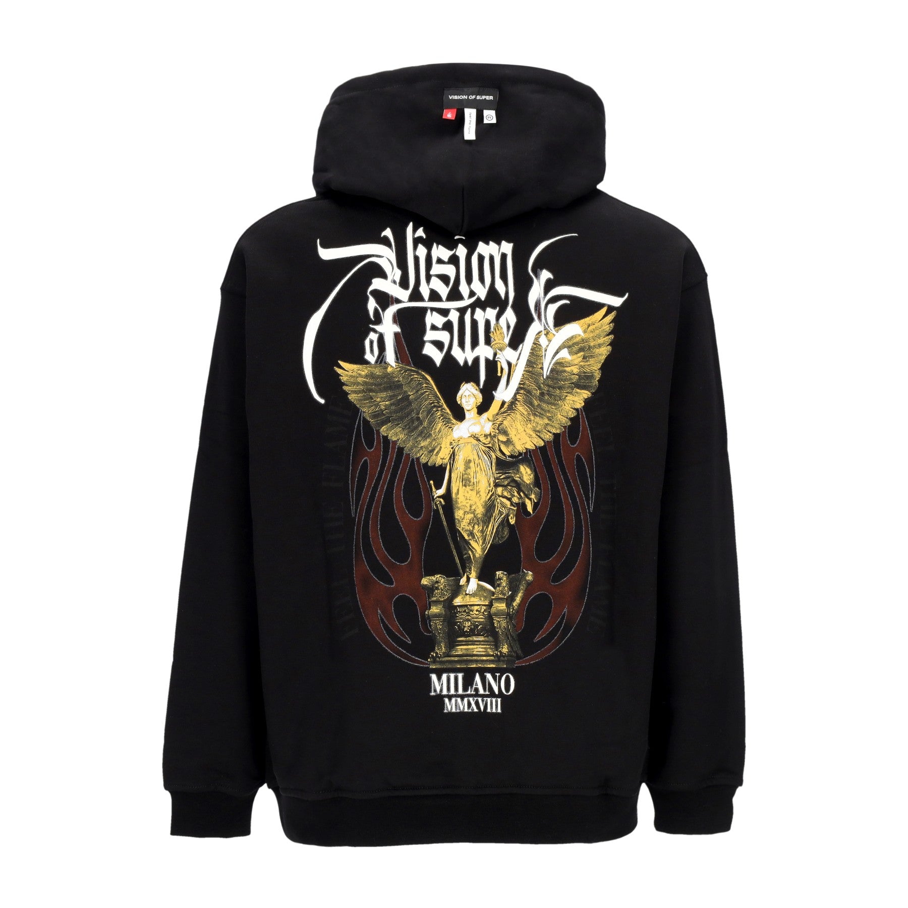 Vision Of Super logo embroidered on label sewn on hood and screen printed Gothic version applied on front and back