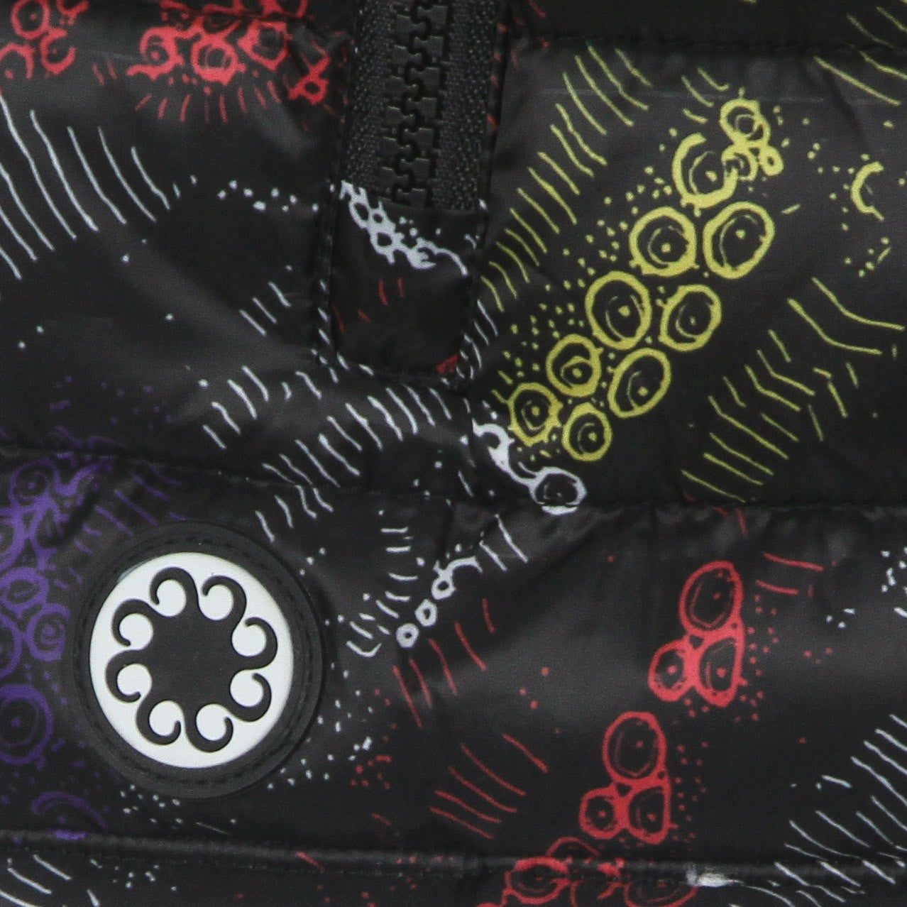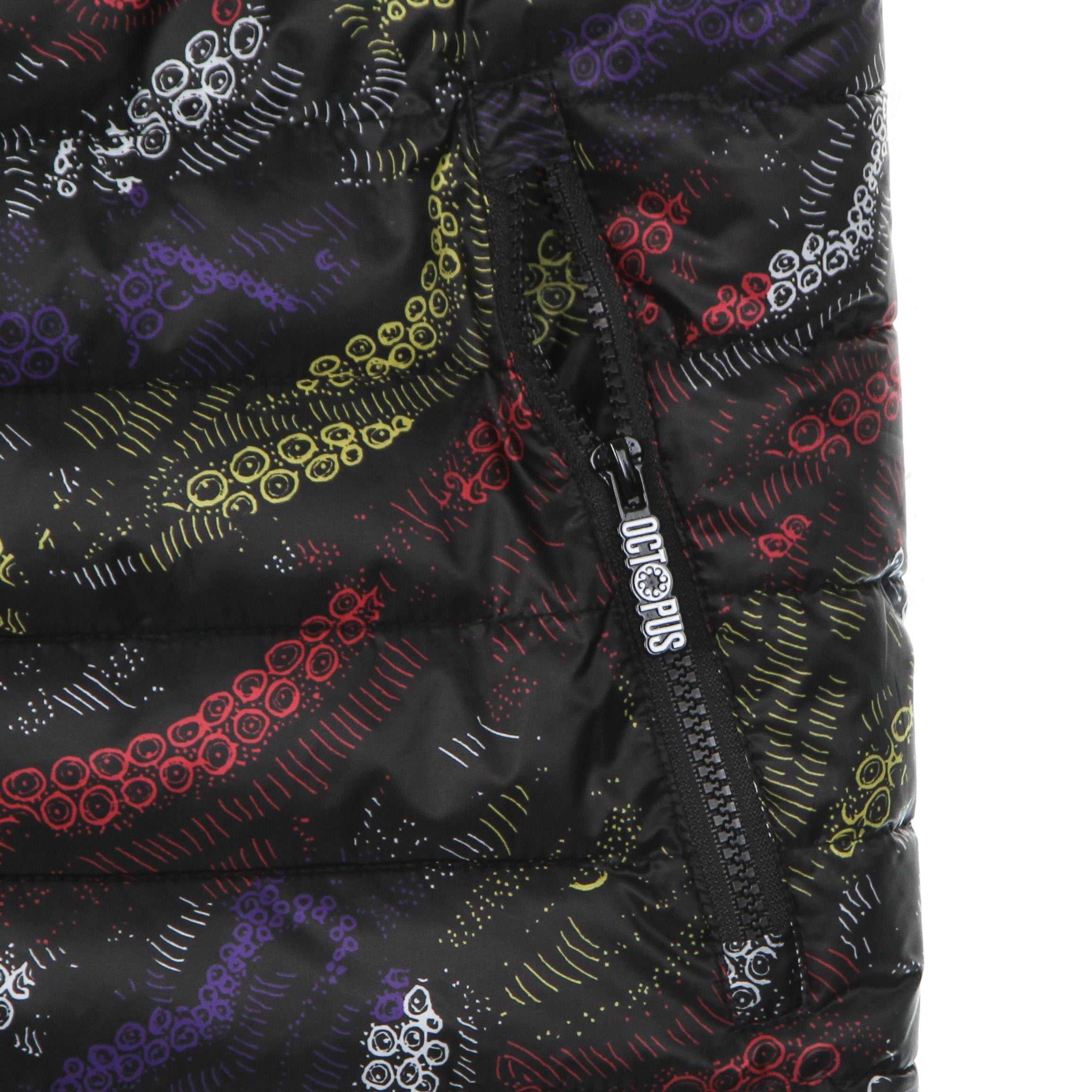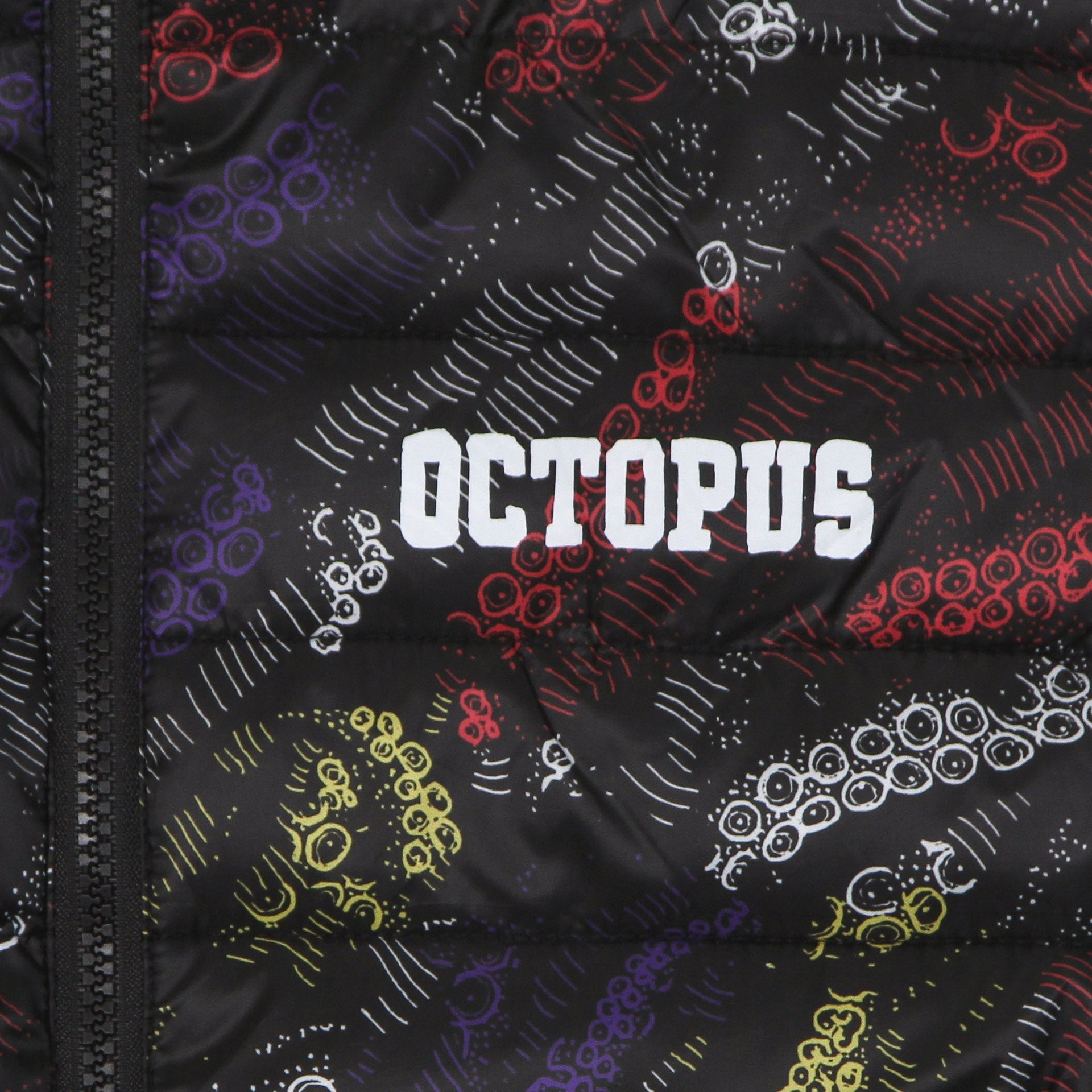 Logotipo de Octopus impreso en el lado izquierdo, bordado en la etiqueta cosida en la parte inferior y en metal como un tirazip
