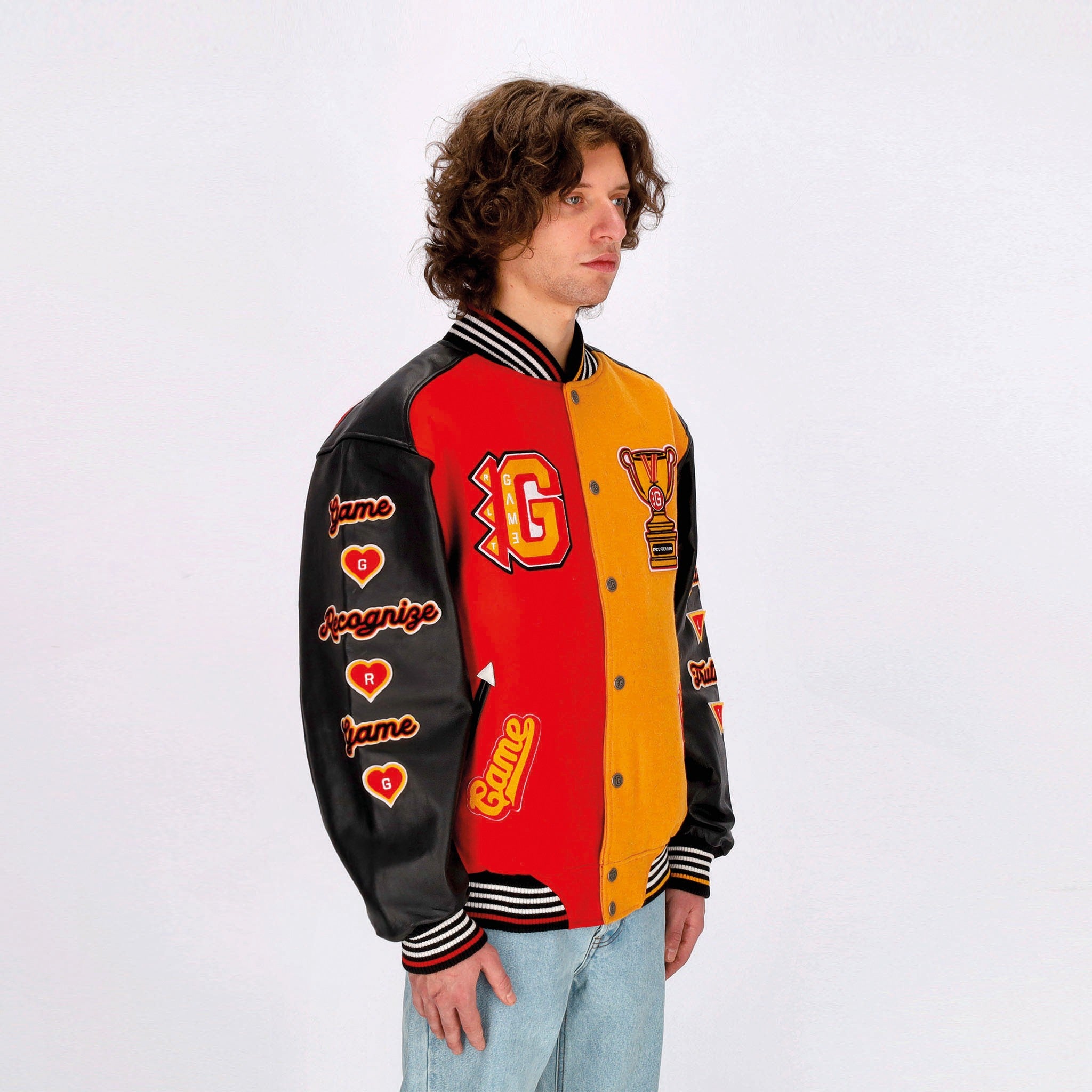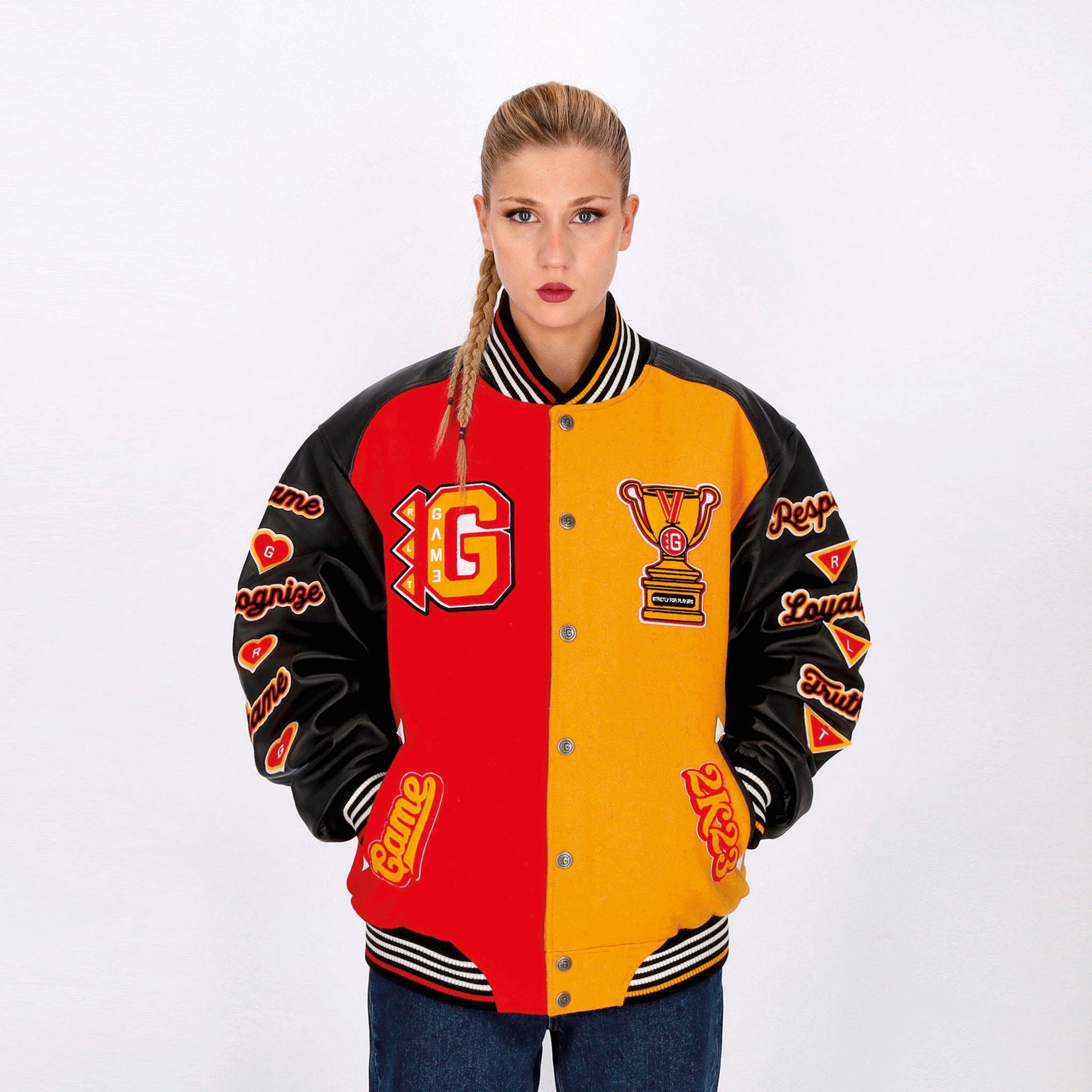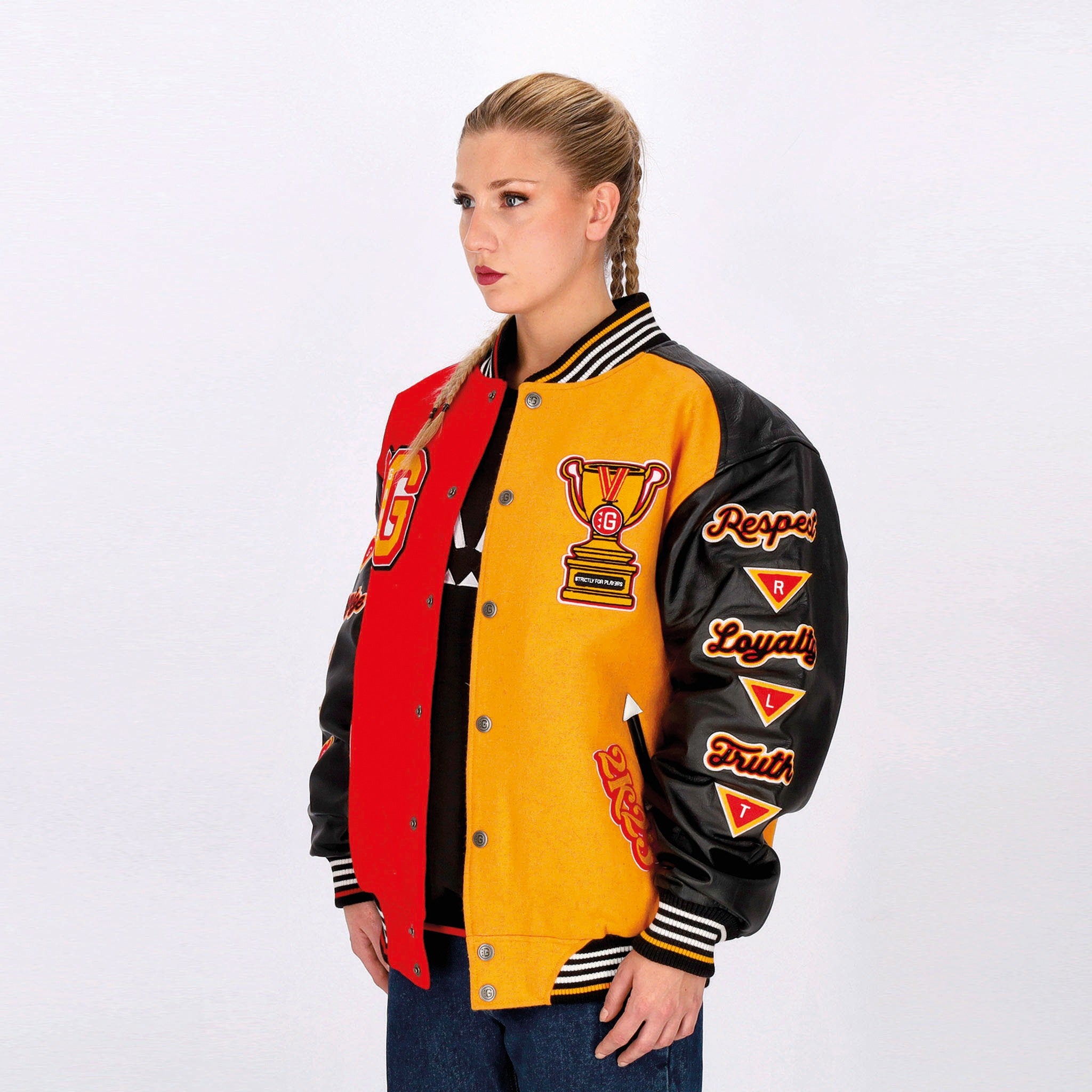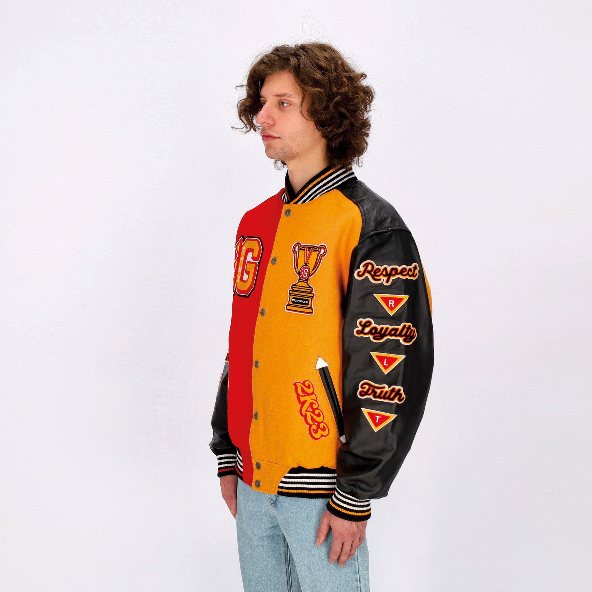 Chaquetas universitarias Hombre Respeto a la lealtad Verdad Varsity Chaqueta Jolly Black/Royal Red/Mostaza