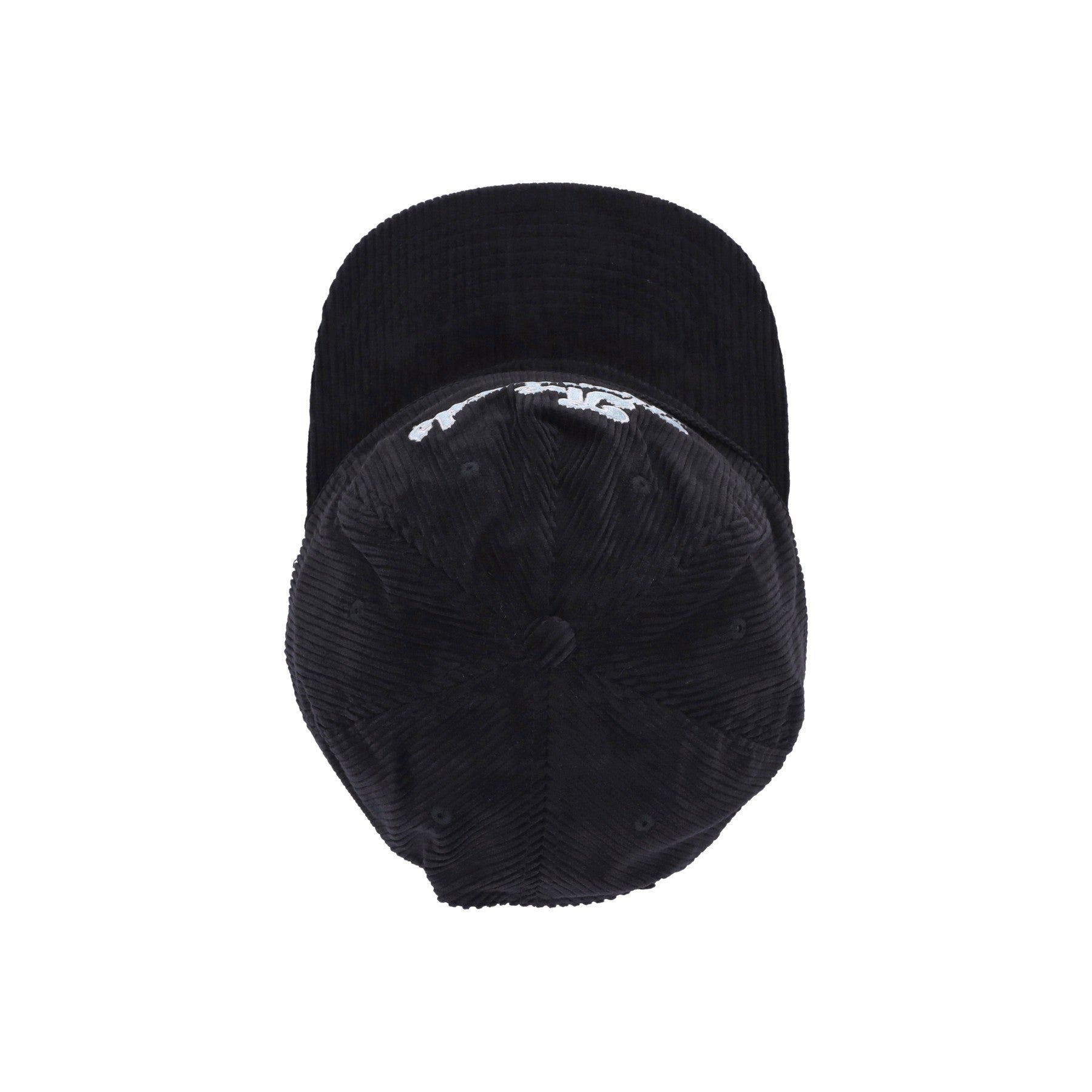 Chapeau décrit avec un velier plat en velours, six panneaux avec une fermeture à snack et des œillets brodés